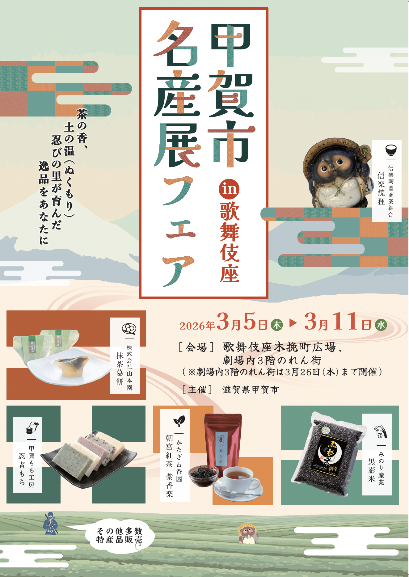 HOME / PROJECTS / 甲賀市名産展フェア in 歌舞伎座ポスター制作 制作 甲賀市名産展フェア in 歌舞伎座ポスター制作 東京・歌舞伎座にて開催された「甲賀市名産展フェア」のポスター・大幕デザイン制作を担当しました。歌舞伎座という伝統ある会場で甲賀の魅力を伝えることができました。 GALLERY クライアント 甲賀市様 期間・日程 2026年2月25日 担当忍者 稲穂 役割 ポスター制作・印刷 RELATED PROJECTS 関連プロジェクト 一覧を見る 制作 甲賀のくすり クリアファイル制作 VIEW PROJECT アクティビティ 制作 甲賀流リアル忍者館 妖忍呪縛匣(サウンドホラーアクション) VIEW PROJECT コンサル 制作 SNS投稿自動化ツール開発 VIEW PROJECT プロジェクト一覧に戻る